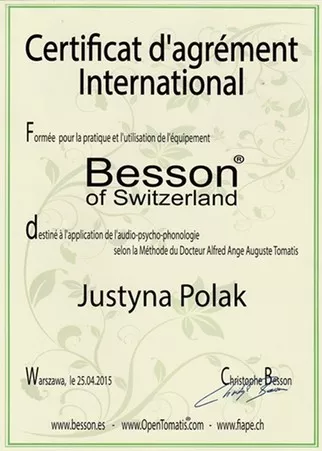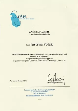 Od 2015 roku prowadzę Gabinet terapeutyczny, gdzie zajmuję się unikalną metodę treningu słuchowego profesora A. Tomatisa. W 2018 roku poszerzyłam zakres działań gabinetu o metodę integracji odruchów wczesnoniemowlęcych (INPP). Metody te wspierają rozwój, stymulują procesy uczenia się dzieci i doskonalą potencjał u dorosłych.